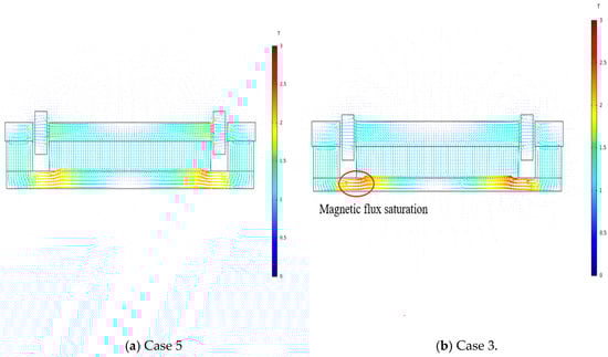 In optimizing the thickness, the changing thickness from −0.2 mm to 0.2 mm shows that the thickness of the yoke greatly affects the force factor. Increasing the size of the magnets lowers the force factor, which means that magnetic flux saturation occurs at the yoke. The magnetic flux flow on Case 5 and Case 3 at the actuator cross section is depicted in Figure 7. From Figure 7, the decreased yoke thickness, Case 3, is causing magnetic flux saturation. The force factor in Case 4 varies more than in Case 5 depending on the coil position. The force factor should be consistent in every position. Thus, Case 5 is chosen owing to the higher force factor at every coil position than in the original prototype. The force factor result in every coil position is shown in Figure 8.