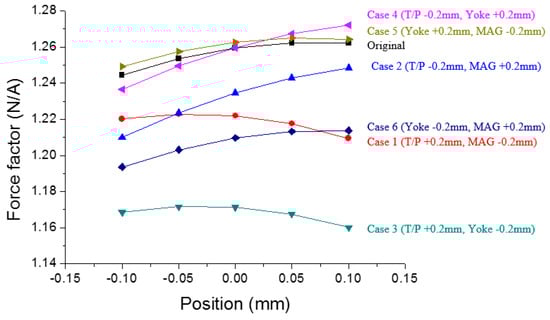 - The variation of the force factor on the actuator when changing the thickness of the actuator’s yoke, top plate, and permanent magnet