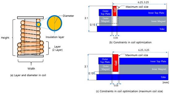 The distance from the coil bottom to the yoke should be at least 0.15 mm. The air gap between the coil and the top plate is fixed at 0.08 mm. While maintaining the coil resistance at 6 Ω, a diameter from 0.05 mm to 0.15 mm is used, and 4, 6, 8, and 10 layers are chosen to determine the maximum force factor. The reason for choosing an even-numbered layer is that from the manufacturing process, the input wire and output wire should start and end in the same position. To maximize the force factor, it is important to find the best combination between the diameter and the total coil length. The constraints and descriptions for coil optimization are briefly shown in Figure 9.