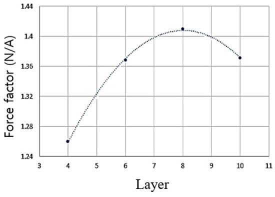 The eight-layer coil with a diameter of 0.11 mm is found to have the maximum force factor. The maximum force factor in 4, 6, 8, 10 layers in a neutral position is shown in Figure 10.