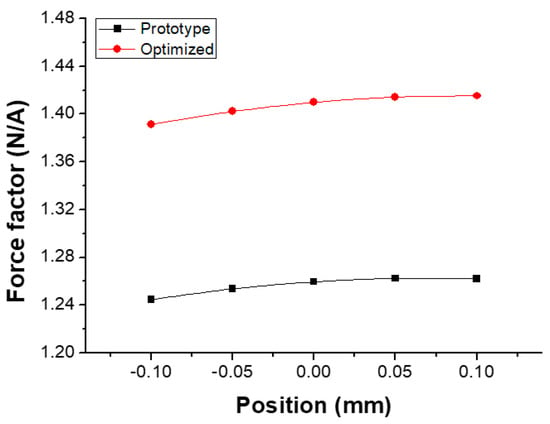 By combining all results, the final optimized force factor is obtained, which is shown in Figure 11. The optimized model has a 12% higher force factor than the original prototype.