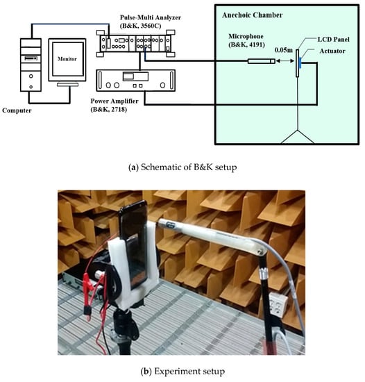 The experiment system (B&K system) for measuring SPL consists of a power amplifier (B&K, 2718, Nærum, Danmark), a microphone (B&K, 4191) and a Pulse-Multi Analyzer (B&K, 3560C). In the B&K system, the accepted sound signal from the microphone is transformed into an SPL curve in the frequency domain by a Fast Fourier Transform (FFT). The experiment is conducted in an anechoic chamber, and the testing distance is selected as 0.05 m in the central axis direction from a microphone. The actuator is attached directly behind the LCD display panel and electric cable is connected to the actuator for the input signal. As input, a sinusoidal signal ranging from 100 Hz to 5000 Hz is used with an input power of 1 W. Figure 13 shows the experiment setups and system connections.