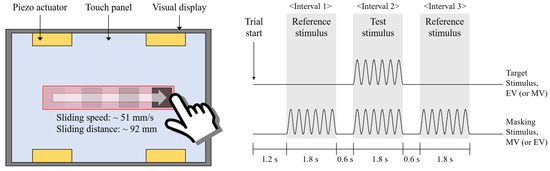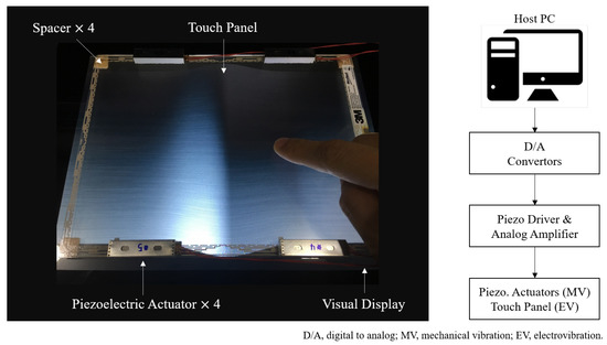 Figure 1 shows the custom-built hardware set-up used to simultaneously apply EV and MV, and a schematic diagram detailing the apparatus control. The set-up mainly comprised of a touch panel (SCT3250, 3M Inc., St. Paul, MN, USA) to generate EV, piezoelectric actuators (PHA 379060, Mplus Inc., Suwon, Korea) to generate MV, and a visual display (STL-100T, StarTech Inc., Busan, Korea) to present the progress of the experiments visually.The touch panel was mounted on a visual display by four sponge spacers at corners. Four piezoelectric actuators were attached to the top of the touch panel around the periphery. The host PC generated respective digital signals to produce EV and MV. These signals were transmitted to two signal processors (NI 9264, National Instruments Inc., Austin, TX, USA) to be converted to analog signals. The analog signals were then amplified by an analog amplifier (SQV 3/500, US Eurotek Inc., Lake Forest, CA, USA) and a piezoelectric driver (DRV8662, Texas Instruments Inc., Dallas, TX, USA). Finally, the signals were applied to the touch panel and to piezoelectric actuators to generate EV and MV, respectively. The users could perceive both EV and MV on the touch panel, as the MV has propagated to the entire panel. Note that this set-up is the same as that used in our previous work. For detailed specifications and performance of the hardware set-up, see the work in [14] and the corresponding supplementary information.