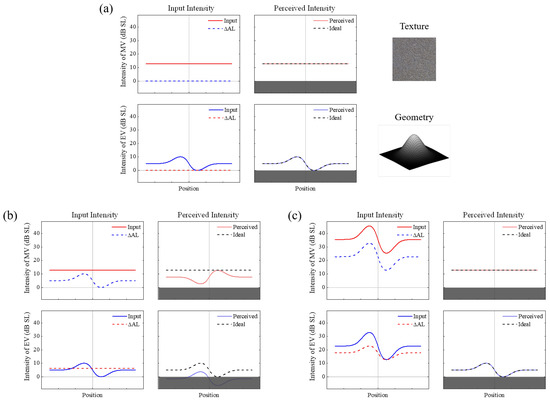 Input and perceived intensity when both geometry and texture information are provided: (a) ideal case, (b) without the algorithm, and (c) with the algorithm.