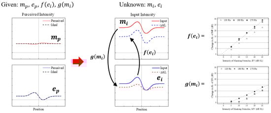 To generalize our approach, it should be possible to compute the required input intensity of both the MV and EV for any arbitrary perceived intensity desired. First, we need to derive a generalized form of the masking functions. The masking function investigated in Section 2 above tended to function linearly in a certain region but had a value of zero in other regions, i.e., the form of a ramp function. These results are consistent with the results of earlier studies [23,24]. Thus, the generalized masking function can be expressed in the form of conditional equations as follows,