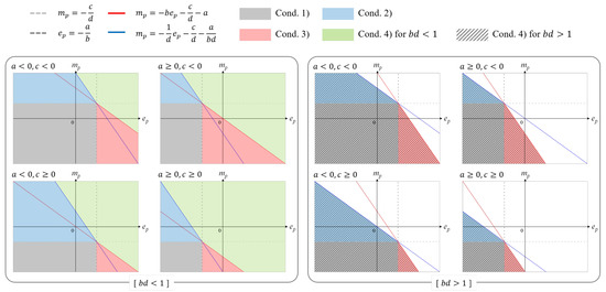 To determine the required input intensity to satisfy the desired perceived intensity, there should exist a unique solution pair, and for arbitrary and . To clarify this, we examined the region where a solution exists for all possible cases. Figure 6 shows the graphical representation of the region of and that satisfies each of the four conditions. The conditions (third column in Table 4) are represented by four lines. The intersection between them is always . This intersection can be in different quadrants, depending on the sign of a and c (the respective intercepts of the two masking functions). As shown in Figure 6, when , the regions satisfying each condition are completely separated, and cover all real numbers of and . In other words, when , there always exists a unique solution, and , for arbitrary real numbers of and . However, when , the regions covered by condition 1 (gray), 2 (blue), and 3 (red) overlapped with the region covered by condition 4 (shaded). In short, if the desired perceived intensity pair, and , is located at the overlapped region, then the solution (input intensity pair: and ) is not unique. Furthermore, the solution does not exist if the desired perceived intensity pair is located at another region that is not covered by any of four conditions. Thus, given that the perceived intensity should be designed as a positive value, the proposed algorithm is not applicable when .