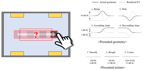 The four geometries rendered by the EV were bump, hole, ascending slope, and descending slope. A Gaussian function was used to render the bump and hole, and an exponential function was used to render the ascending and descending slopes. The height and width of each geometry were set so that all four had the same height and inclination maximums. The target intensities were set to range between 0 and 10 dB SL. The intensity of the EV was determined based on surface gradient [21], and its frequency was set to 270 Hz. The three textures, named smooth, rough, and coarse, were rendered by varying the frequency and intensity of the MV. These were selected through an informal pilot test designed to identify the parameters for which the users could discriminate intuitively between the three. The target intensities for texture rendering were 6 dB SL for smooth and 12 dB SL for rough and coarse. For the coarse texture, we used a carrier frequency of 120 Hz and an envelope frequency of 40 Hz. As this stimulus was not tested in experiments I and II, we performed a pilot test to obtain the ALs and masking functions for this combination.