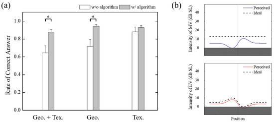 Result of the user test: (a) mean rate of correct answers in the geometry and texture discerning test. Error bars represent the standard deviation. Asterisks denote a significant difference between the groups (); (b) example of the expected perceived intensity without the proposed algorithm (a case of combined bump and rough).