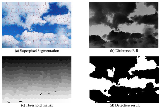 Other works solve the problem of object identification using an undirected graph [14]. Computing the graph association matrix could be computationally expensive; in the worst-case scenario, it is a problem of complexity [7,14]. These approaches are not suitable for real-time applications working with high definition images [9]. In Reference [13], an automatic cloud detection for all-sky images using SPS is presented; the result and implementation of this algorithm shown in Figure 2. It can be seen that even if it is a good approximation, some information is lost in the final result. Considering these results and the computational complexity of the algorithm, it may not be suitable for these kinds of applications.