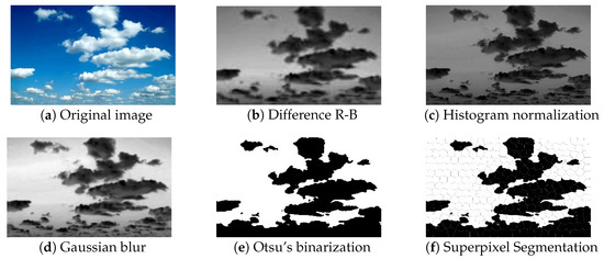 - Liu, S.; Zhang, L.; Zhang, Z.; Wang, C.; Xiao, B. Automatic cloud detection for all-sky images using superpixel segmentation. IEEE Geosci. Remote Sens. Lett. 2014, 12, 354–358. [Google Scholar]