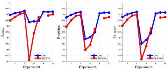The confusion matrices for both techniques are very close. To get a better understanding for each matrix the macro versions of the recall, precision, and f1-score, in Table 3. In Figure 10, the same score to get a better visual understanding of proposal performance is plotted. The proposal overcome the SPS-SVM in almost all the samples (except for the sample seven).