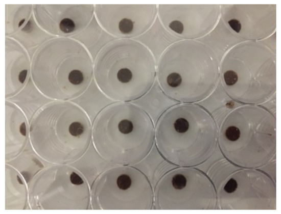 For the cytotoxic evaluation, a cell line of normal primary dermal fibroblast was used: human, neonatal (HDFn) ATCC® PCS-201-010. The cell line was provided by the stem cell biology laboratory of the Faculty of Medicine of the Autonomous University of the State of Morelos, México. The cells were cultured, according to the ISO 10993-5:2009 protocol, in 2 mL of DMEM culture medium, which contains glucose, L-glutamine, sodium pyruvate, sodium bicarbonate, and sterile-filtered liquid, in 24-well plates at a density of 10,000 cells/cm2. Human fibroblast cultures were propagated to obtain a semi-confluent density of 80% (4 days of culture). Subsequently, a sample of LBMs, previously bored to 6 mm Ø and sterilized with ultraviolet (UV) light for 30 min on each side, were isolated from moisture and covered with foil until used. They was deposited in Transwell-COL collagen-coated polytetrafluoroethylene (PTFE) inserts with 0.4 µm pore size and 6.5 mm diameter (Figure 1). The test was carried out in triplicate.