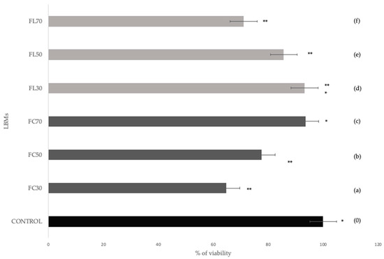 A tested LBM has cytotoxic potential when the cell culture viability decreases to <70% in comparison with the control group, which was set at 100% viability [22].