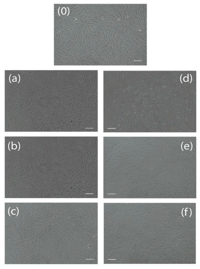 Stereotypical micrographs of the different fibroblast culture media evaluations of all LBMs: 0 control group, (a) FC30, (b) FC50, (c) FC70, (d) FL30, (e) FL50, and (f) FL70. Bar 100 μm.