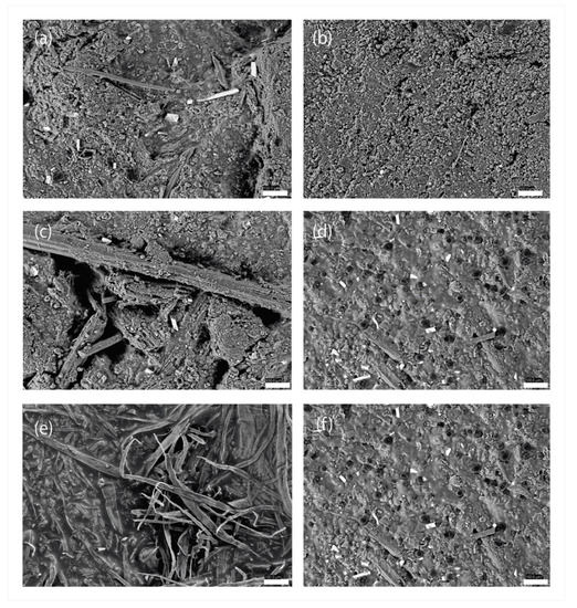 Scanning Electron Microscope (SEM) images of LBMs (a) FL30, (b) FC30, (c) FL50, (d) FC50, (e) FL70, and (f) FC70. The bar corresponds to 100 μm, 60× magnification.