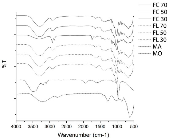 FTIR spectra of different LBMs obtained (MA: Aloe barbadensis Miller mucilage; MO: Opuntia ficus-indica mucilage.