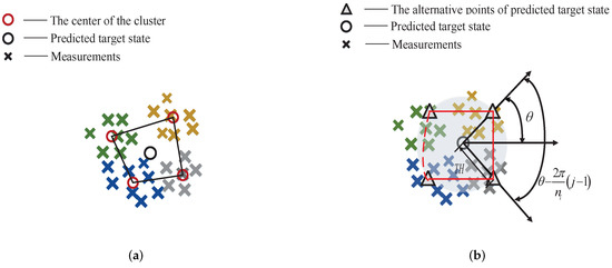 Step 4. Calculate the distance between each measurement and the predicted state , and sort them from smallest to largest. Afterward, the one in the middle is selected as the first alternative initial clustering center . The distance between and is denoted by . Let be the first alternative point . The other alternative points can be considered as the vertexes of a regular polygon, and their locations are calculated by Equation (3). Then, all alternative points are obtained to replace the corresponding predicted state .