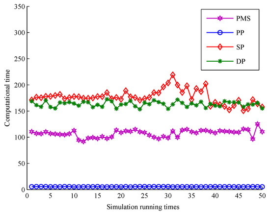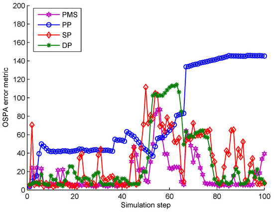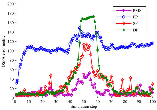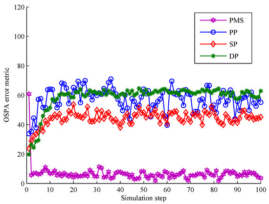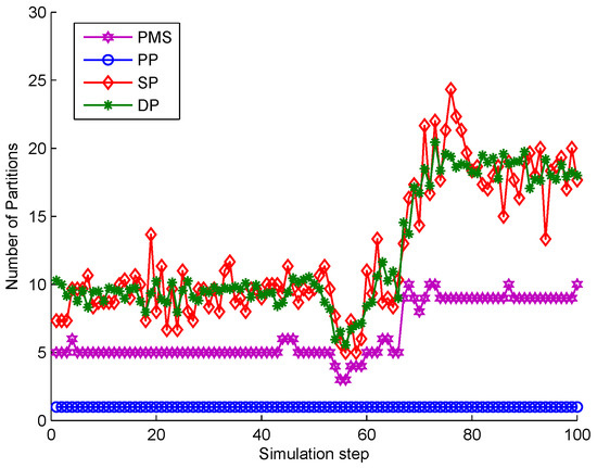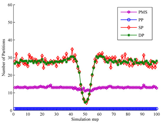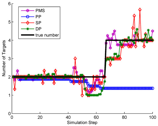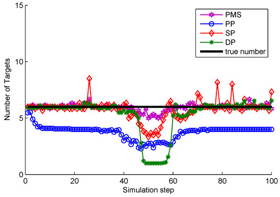 The comparison of partitioning number is shown in Figure 16. The partition number of PMS is much lower than that of DP and SP. From s to s, the partition number of DP and SP is a little lower than PMS because measurements are densely distributed making the number of distance thresholds reduced. However, combined with the comparison of tracking performance in Figure 15 , it can be seen that the partitions obtained according to these distance thresholds contribute little to the tracking performance. Unlike DP and SP, when targets are crossing, PMS still has almost the same number of measurement partitions as that at previous time steps. Moreover, these partitions obtained by PMS are more accurate than these of DP and SP (as seen in Figure 15). It means that PMS does not add computation time to achieve better tracking performance in this scenario. Because PMS only replaces the unreasonable target predictions in each partition by alternative points to obtain more reliable target centers, which does not increase the extra partitions. The analysis of PP and PMS is detailed in the above subsection.
