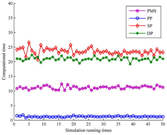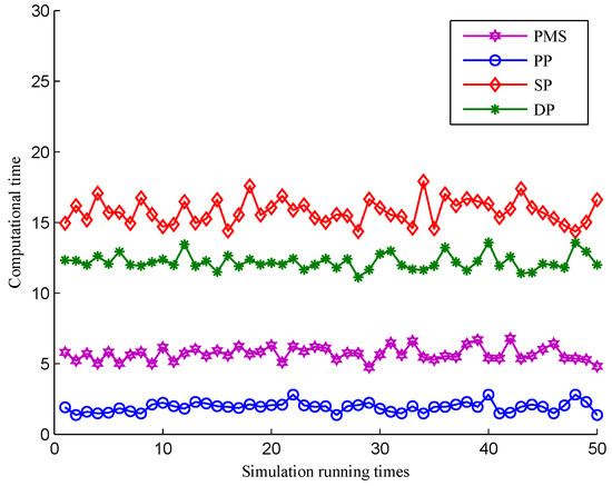 Here, the computation time of four algorithms is given in Figure 17. Combined with Figure 16, we can see that the computation time decreases rapidly when the number of partitions decreases, which implies that the number of partitions can directly affect the tracking speed.