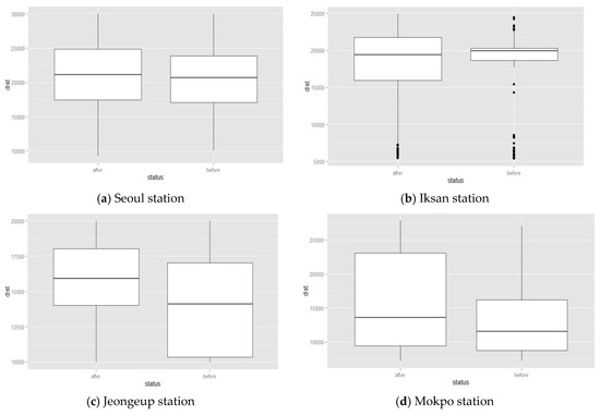 Figure 3 shows the box-plot of access distance range of mobile population. The box-plot represents the ranges of access distance to reach HSR station. We expect that if someone benefits with a short travelling time by using the HSR, then he/she would access an HSR station even if he/she resided far away from the HSR station. Therefore, Iksan and Mokpo stations were determined to have wider spectra of access distance after the launch of the HSR as the lower-and-upper quartile ranged wider compared to before condition. This illustrates that HSR attracts more people from a distance of approximately 10–15 km to 10–22 km at both stations. Jeongeup station shows an increase in the median access distance, although the access distance range is slightly decreased. Thus, the access distance range may vary depending on the city size, socio-demographic characteristics, and income level, etc. These results show that the HSR attracted more people living in widely from the area near the station, while the range of lower-and-upper quantiles varies at stations. This is especially true for Jeongeup, which is the smallest city along the HSR line with a population of approximately 114,000, consisting of over 30% of the age group of 60. However, it is difficult to determine the reason of decrease in the access distance at Jeongeup station. In contrast, Seoul station shows similar lower-and-upper quantile range of access distance although the median distance is barely increased. Therefore, we understand that the opening of the HSR had a relatively small effect on the mega city in terms of access distance range.