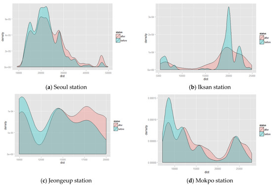 With respect to the density of access distance to the HSR station, the origins (home) of mobile population are within 40 km, and a majority of them ranged between 10–25 km from Seoul station; however, the distribution of density before and after is similar. Interestingly, it is found that the distribution of access distance at Iksan station mainly ranges between 20–25 km, and it is smoother than before distribution, which is different from Jeongeup and Mokpo, where the distribution mainly ranged within 20 km. Jeongeup station is shown to expand the access distance to 15–20 km after the opening of the HSR.