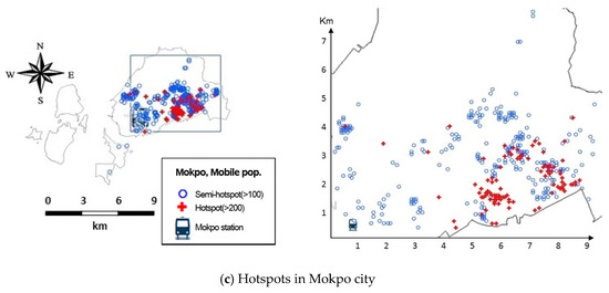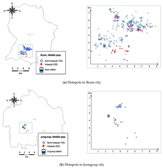Figure 5 shows the hotspots changes caused by HSR in the three cities. We developed a map to identify the hotspot locations, showing the difference of mobile population before and after the opening of the HSR. In the figure, we define the hotspot and semi-hotspot with the increased mobile population over 200 and 100, respectively. As shown in Figure 5a, Iksan city has a population of approximately 300,000 people, with an area of 506 km2. There are many spots that changed to semi-hotspots and hotspots due to the HSR, and the hotspots are shown to be appear within 10 km of Iksan station.