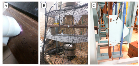 In accordance with ASTM D6109, WPC lumber specimens with dimensions (w = 139 mm, h = 33.5 mm) were cut to an adequate length to fit the span (L), 853 mm with an adequate length for the overhang at each support (a = 51 mm), as shown in Figure 1. To achieve the magnetic mounting of the string potentiometer that measures the creep deflection to the midspan of the specimens, a 3-min corona treatment (Figure 2A) and 5-min hardening epoxy were used to adhere a square metal piece (19 × 19 mm) to the midspan of each specimen (flatwise), as shown at point c in Figure 1. Afterwards, a magnetic hook was mounted on the square metal and the string potentiometer was attached to the hook during the creep loading, and hence, the creep midspan deflection was acquired, accordingly. This type of hook was used to avoid any damage might occur to the string potentiometer in case the specimen experienced an abrupt failure during the creep experiment.