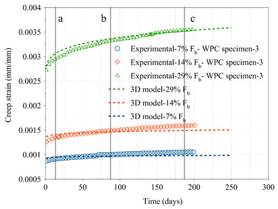 Table 1 represents: a summary to the experimental results obtained from the quasi-static testing, the applied levels of stress (flexural) to each group of WPC and the stress level applied to each WPC specimen in each group, the values of inserted in Equations (2) and (3), and the computed parameters. Figure 3 shows a typical relationship between the experimental creep strain versus time of three WPC specimens at three different stress levels (7% Fb, 14% Fb, and 29% Fb) and the selected lines (a, b, and c) on these relationships used to compute the Norton-Bailey parameters [19,20]. The mechanical properties were: Fb = 41.2 MPa and E = 4.34 GPa. The applied stress levels were: 2.98 ± 0.08, 5.88 ± 0.04, and 11.84 ± 0.1 MPa.