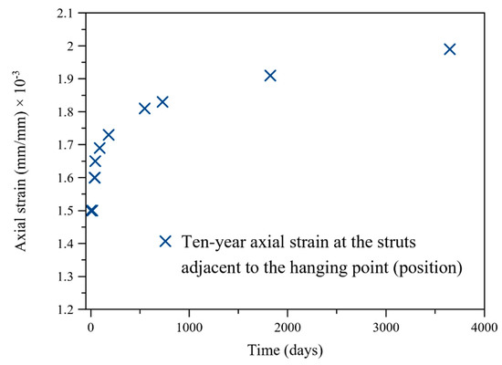 Ten-year (3650 days) time-dependent axial strain of the WPC strut adjacent to the hanging position of the cage structure.