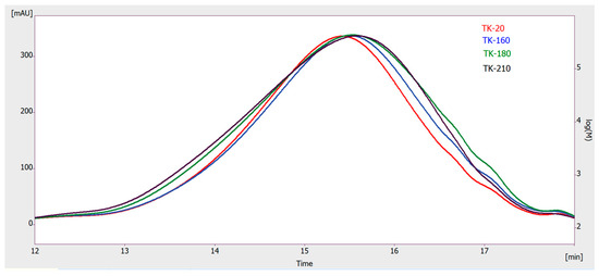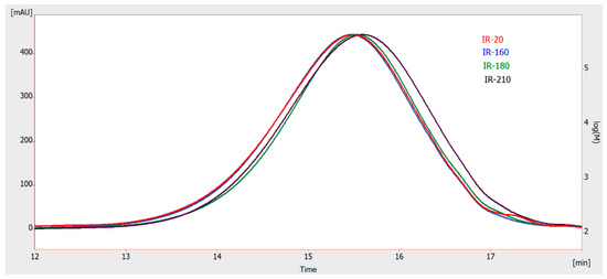 Lignin isolated from iroko wood has a different molecular weight (about 38% lower) and polydispersity (about 44% lower) when compared to teak lignin. These values (Mw = 4500 g·mol−1, Mn = 2100 g·mol−1, PD = 2.1) are lower than those published by Zikeli et al. (2019) [37]—(Mw = 13,900 g·mol−1, Mn = 2300 g·mol−1, PD = 5.7). The differences may be due to different growth locality, lignin isolation procedure, and the chromatographic method itself. During the thermal treatment, iroko lignin changes in a different way than teak lignin. At 160 °C, low molecular weight lignin fragments are degraded (Figure 2), resulting in a slight increase in molecular weight and a negligible decrease in polydispersity. Degradation reactions are predominant at 180 °C and the molecular weight decreases by almost 10% when compared to the original sample. Changes in MW are significant, some changes in PD are significant, while others are not. The temperature of 210 °C causes both condensation and degradation reactions (which prevail) and the molecular weight decreases (Figure 2, Table 5). A similar trend was observed at the thermal modification of oak wood [44].