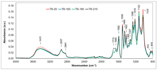An increase in the band at 1665 cm−1 (C=O stretching in various conjugated groups in lignin) [59,60] was observed at teak wood at 210 °C (this band did not appear at any temperature value for the iroko wood). This trend may be an indicator of the cleavage of α-alkyl-aryl ether linkages [25]. The peaks near 1600 cm−1 and 1500 cm−1 (C=C aromatic skeletal vibrations) [61,62] show only small changes with increasing temperature (a more pronounced decline is noticeable in the iroko wood). This trend suggests the relative thermal stability of the lignin aromatic structures [63].