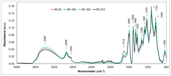 The band at 1120 cm−1 (C−H vibration in lignin) is typical of syringyl units [67,68]. This band markedly decreased with an increasing temperature in both wood species. Compared to the band near 1220 cm−1, there is a notable decrease in absorbance, which may be due to higher thermal stability of guaiacyl structures against syringyl ones, as reported by Ragauskas et al. [69].