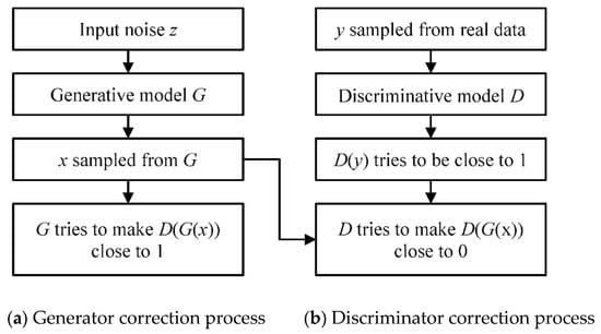 As seen from this figure, a GAN offers improved efficiency by allowing two models to be trained at the same time: one is a generative model (G) used to capture the data distribution, and the other is a discriminative model (D) used to estimate samples. G and D learn in an adversarial manner. D models the real data, giving it the ability to identify the authenticity of such data. On the one hand, G generates various solutions in a certain space to train D’s discriminative ability. On the other hand, G attempts to find an optimal solution among these solutions that will be mistakenly identified by D as real data. Thus, a dynamic “game process” between G and D serves as the GAN optimization process. The equilibrium point in the game is the only solution. The corresponding model optimization function is shown in (8):