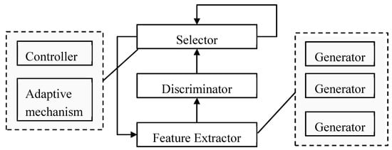 The AGAN framework is shown in Figure 3. An AGAN consists of three parts: a selector, a discriminator, and a feature extractor. The feature extractor contains multiple generators. The selector contains a controller and an adaptive mechanism. In this framework, the feature extractor extracts feature vectors of different dimensions. The extracted feature vectors are input into the corresponding discriminator to score the feature results. In this way, the feature extractor not only learns to extract dimensional characteristics through regular supervised training but also learns to extract features with better generalizability by deceiving the discriminator. To achieve more accurate feature descriptions and a faster iteration speed, the generators for different dimensions in the feature extractor are selectively promoted by the selector. The selector is used to adaptively coordinate the network. The selector is also used to adaptively select which dimensional features are considered.