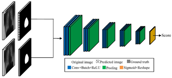 The discriminator in the network is used to identify whether a given segmentation result comes from the prediction of the model or is a real result. If the discriminator has a high level of discrimination but still cannot distinguish predicted results from real results, this indicates that the prediction model has a good expression or prediction ability. Since the feature extractor in the AGAN contains two generators, the discriminator here can also be used to evaluate the quality of these two generators. In the AGAN, the discriminator’s discrimination process for each generated result is the same as that of the discriminator in a GAN [27], and its structure is shown in Figure 5.