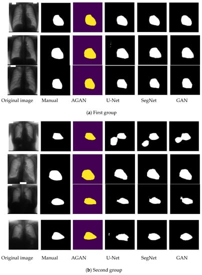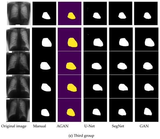 The database does not contain the results of manual segmentation as a reference. However, from the qualitative analysis of the experimental results, it can be concluded that AGAN is effective on X-ray images of non-JSRT data, and most of the results are also shown to be better than the other algorithms. In detail, the cardiac area in the first group of images is almost completely surrounded by the lungs and their edges are clear. All four algorithms have excellent segmentation results in this group of images. In the second group of images, the cardiac area is irregular in shape. In most cases, the AGAN segmentation result is slightly better than other methods. The conclusion is consistent with the experimental conclusion of the JSRT database. In the third group of images, it can be seen that while the segmentation results of the other networks are not desirable, the AGAN still performed well. This shows that the two generators can better extract features. Among the 122 pictures, four pictures failed to be segmented using AGAN, as shown in the last two figures in Figure 9. These graphs were also unsuccessfully segmented by using the other three methods. Therefore, the AGAN algorithm is reliable.