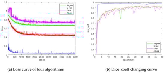It can be seen from Figure 8 that both GAN and AGAN are based on adversarial networks, and the loss curves are relatively volatile, whereas loss curves of Segnet and U-net are more stable. The loss curve of AGAN drops faster than GAN, and tends to become stable earlier, and the performance in the later period is more stable. The speed of the dice_coeff is also improved faster than GAN. With reference to the results of the dice_coeff in the test set, there is no overfitting in the networks AGAN and GAN. This also confirms that algorithms based on GAN can avoid overfitting. It can also be found from the testing set results that U-net demonstrates a certain overfitting phenomenon.