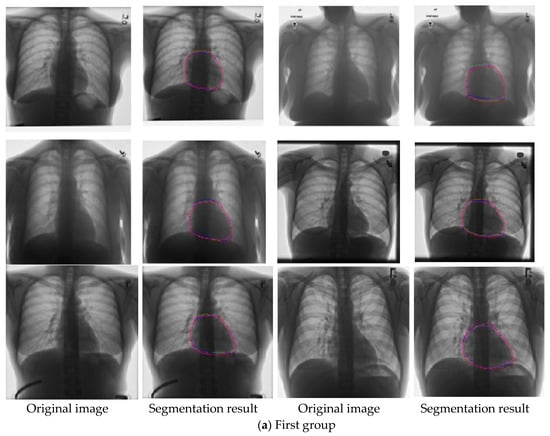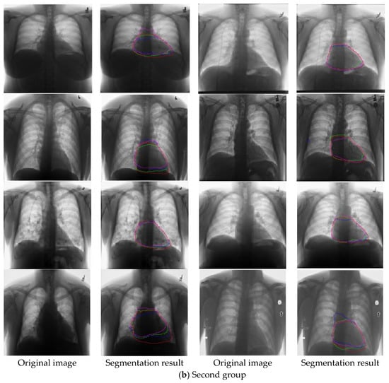 Accuracy refers to the consistency between an algorithm’s segmentation results and the true segmentation results and is one of the most important indicators for evaluating segmentation algorithms. It can be seen from the experimental results that in terms of accuracy (acc), the network proposed in this paper outperforms the SegNet, U-net, and GAN models. Although the differences between them are not significant, the calculation formula for acc shows that there may be only a few false positive pixels for each of the various methods. In terms of dice_coeff, the result of 94.06% for the network proposed in this paper is 0.9% higher than that for the GAN model and 1.97% and 1.65% higher than those for the other two networks. Due to the small ratio of the area of the heart to the area of the entire X-ray chest radiograph for each segmented image, even a 0.9% improvement in dice_coeff is already significant. This can also be seen from Figure 7 and validates the previous assumption. The improvement in dice_coeff is mainly due to the increased sensitivity of segmentation. Since the algorithm proposed in this paper uses two dimensions to extract features, its sensitivity is more than 0.6% higher than that of the other algorithms. By contrast, there is not much difference in the specificity of the algorithms.