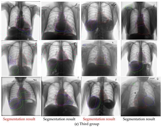 There are a total of 247 training and testing images in the JSRT database, which is a relatively small number, and which has only two groups of classifications. To illustrate the reliability of the network, the “chestX-ray8” (https://www.cc.nih.gov/drd/summers.html), the largest chest X-ray data set, was used as the experimental object. The database comprises 108,948 frontal view X-ray images of 32,717 unique patients. It includes images of atelelectasis, cardiomegaly, effusion, infiltration, mass, nodule, pneumonia and pneumathorax. We randomly selected 122 images from different disease categories and segmented them using different algorithms. Their results are shown in Figure 9.