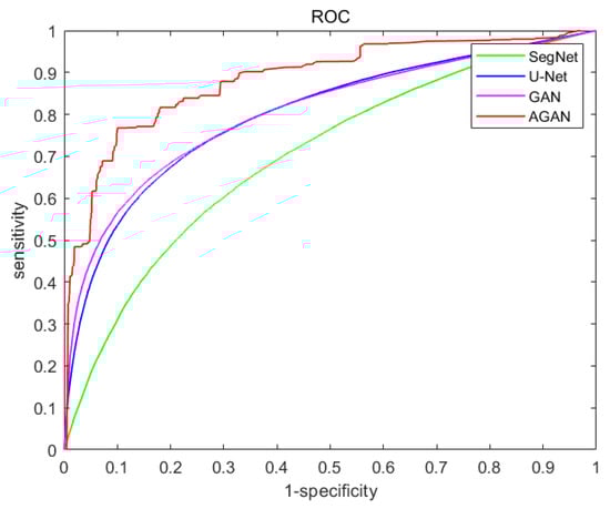 The horizontal axis in the ROC curve is 1-specificity (false positive rate), while the vertical axis is sensitivity (true positive rate). The calculation formula is shown in formulas (9) and (10). The FN is replaced by the smooth factor. If the smooth factor is small, the ROC curve is difficult to distinguish, so when drawing the ROC curve, the smooth factor takes a larger value. The ROC curves combine the true positive rate and the false positive rate graphically, which can accurately reflect the relationship amongst the various algorithms. The red curve in the figure does not intersect with other curves and is closest to the upper left corner. Therefore, the performance of AGAN is better than the other three networks. However, the ROC curves of the other networks are smoother. This is because AGAN has a selector to make a selection, so it cannot be smoothed on the excessive threshold.