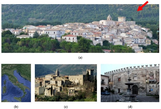 (a) The town of Bussi sul Tirino; (b) localization from Google Earth (42°35′37.16″ N 15°08′03.05″ E); (c) the castle; (d) the main façade of the castle.