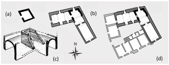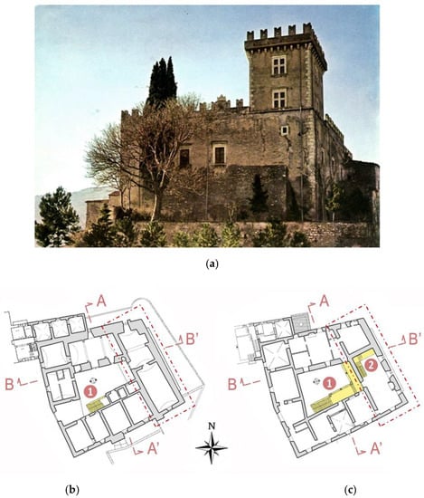 This building can be classified as a “fortified palace”, a specific class of ancient buildings characterized by massive structures and equipped with fortification elements, of which the actual configuration is the result of subsequent transformations that have occurred over time [38]. Indeed, the Bussi Castle was transformed and extended over the centuries, via drastic formal amendments, substantial changes, and enlargements not only to repair the extensive damage suffered over the centuries due to recurrent severe earthquakes, but also to adapt the original construction to residential use [38]. The palace originated in the 11th century as a watchtower (Figure 2a) erected for defensive purposes.