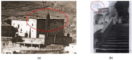 A view of the castle building at the beginning of the 20th century. Ruins of the tower in red circle: (a) exterior view; (b) view from the stairway and the lodge; (photo courtesy of the Municipal Historical Archive of Bussi).