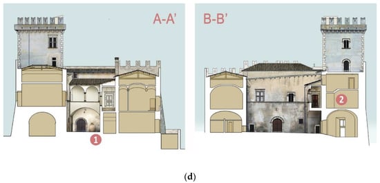 In the 1706, the Maiella earthquake (Grade VII on the Mercalli scale) caused severe damage throughout the Bussi municipality and, although there is no certain information about the castle’s condition, subsequent historical documents report that [39] it remained in a precarious condition until the mid-nineteenth century [40]. After that, substantial transformations were carried out [41]. Radical variations on the stylistic elements were realized and non-structural, thin “in folio” brick vaults were built at the first floor.