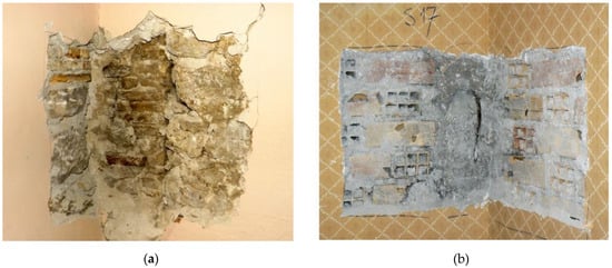 Visual inspections were carried out on bare masonry walls, removing a small amount of plaster in selected zones (Figure 5a). In particular, the goal was to properly identify the stone and mortar typology and condition, the masonry texture, and the bonding condition between orthogonal walls. Additionally, endoscopic tests revealed the masonry composition throughout the thickness.