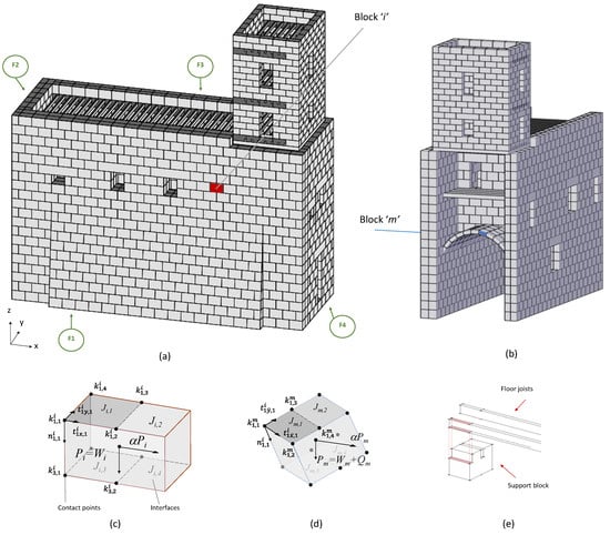 The numerical model of the castle: (a) exterior north-east view with labeled façades; (b) interior south-east view; (c) a sample of the adopted rigid block model and loading condition. The block type “i" presents six interfaces of four contact points each. Normal forces and two shear forces () act at each contact point along the local block axis. The self-weight Wm and the live loads αWm are applied at the centroid of the block. (d) A voussoir block type; (e) details of the rigid block shapes for the rigid blocks supporting the floor joists.