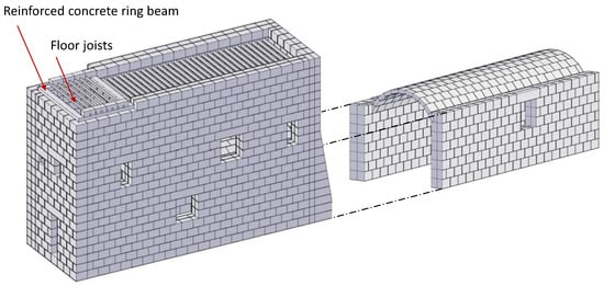 The numerical model of the selected structural unit of the castle included four external façades, the tower, the barrel vault of the ground floor, the internal walls, and the floors (timber and reinforced concrete slab at the first and second floors, respectively). Floors were modeled through joists connecting masonry blocks. Figure 6 displays some exterior and interior views of the numerical model.