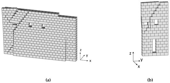 The in-pane collapse mechanism provided by LiABlock_3D: (a) the F1 for live loads along the negative x-axis; (b) the F4 façade for live loads along the negative y-axis.
