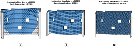 The out-of-plane collapse mechanisms of the F3 façade with participating mass in blue for the meshes (a) M1, (b) M2, and (c) M3.