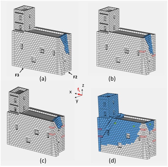 As for the last retrofitting intervention (R3), in addition to the aforementioned quoins, a set of ties was applied. Those were modeled in LiABlock_3D through the insertion of washer-bearing plates (green blocks in Figure 12d) modeled as special rigid blocks of null volume and active vertical contacts at the interface between the façade and the plate itself. Constant horizontal forces, equal to the ties’ failure load, were applied to the bearing plates, so as to simulate the effect of tie forces.